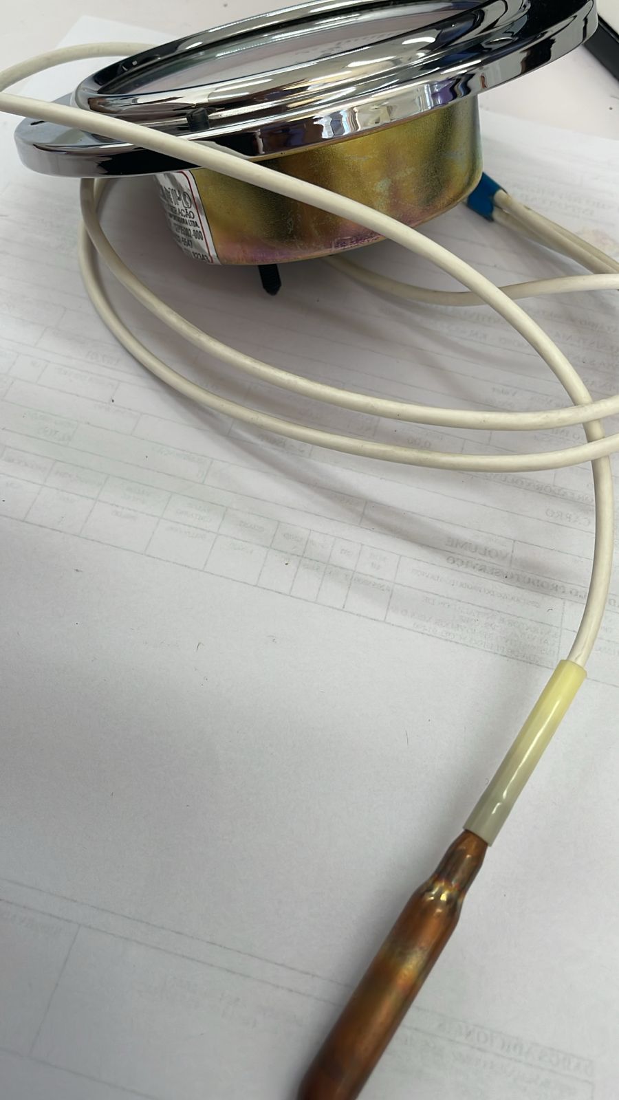 Termômetro analógico tipo remoto, com escala de temperatura de -40°C a +40°C, ideal para aplicações industriais, refrigeração e processos térmicos que exigem leitura à distância. Equipado com rabicho capilar de 1,5 metros e mostrador de 4″ (aproximadamente 100 mm), proporciona leitura clara, precisa e com excelente alcance visual.